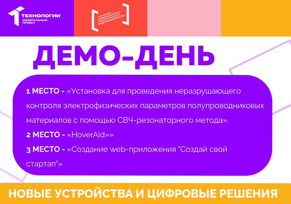 1 место — проект ТГУ 043ц: «Установка для проведения неразрушающего контроля электрофизических параметров полупроводниковых материалов с помощью СВЧ-резонаторного метода»;