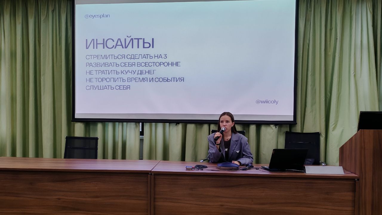 На встрече со студентами Алина рассказала о нескольких переломных моментах в развитии EYESPLAN. Первым вызовом для основателей компании стало делегирование обязанностей. Два года Алина и Даниил работали в студии вдвоем, выполняя все задачи самостоятельно. Но стало очевидно: для развития нужна команда. Трудным оказалось не только найти людей, но и настроить себя на доверие.